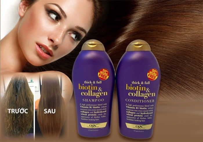 - Dầu xả Biotin & Collagen OGX cung cấp độ ẩm và dưỡng chất thấm sâu, phục hồi từ bên trong sợi tóc, ngăn lão hóa, tăng sự đàn hồi, dẻo dai của sợi tóc, giúp tóc bóng mượt tự nhiên.
