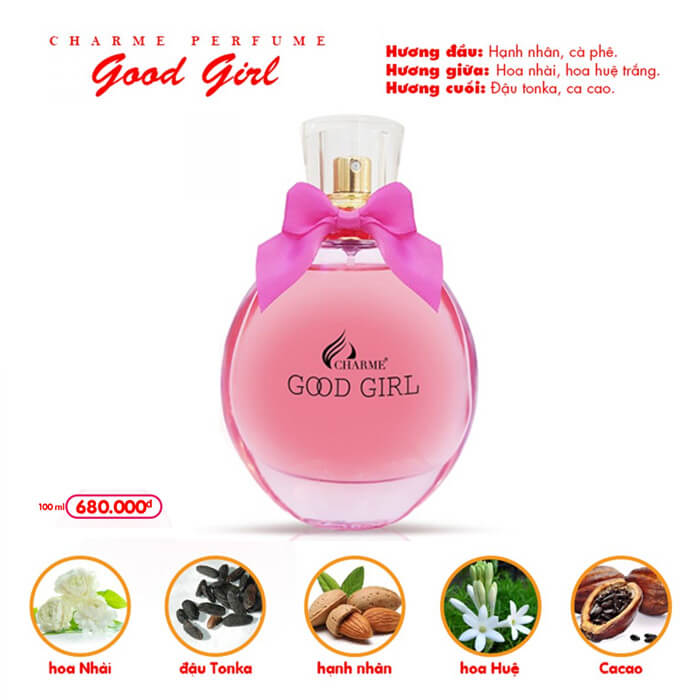 Charme Good Girl là một sự kết hợp đầy mới lạ, tạo một phong cách độc đáo riêng biệt dành cho người dùng bởi những thành phần là hoa huệ, đậu Tonka tinh khiết, nồng nàn, khéo léo thể hiện tính cách của người phụ nữ. Hoa nhài Sambac trắng và cacao cũng là những thành phần mang đến vị ngọt đậm đà quyến rũ cho Good Girl.