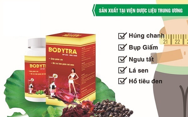 - Thuốc giảm cân Bodytra là sự kết hợp đặc biệt giữa những dược liệu cả trong và ngoài nước, đặc biệt là húng chanh Ấn Độ có thành phần Forskolin – một hoạt chất có tác dụng hỗ trợ giảm cân cực kỳ tốt, được sử dụng phổ biến tại Mỹ, giúp hỗ trợ làm giảm hấp thu và tăng cường chuyển hóa mỡ, giúp giảm cân và hạ mỡ trong máu.
